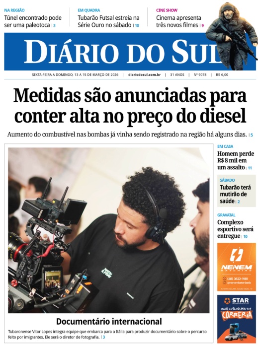 Data de veiculação: 13/03/2026Veículo: Diario do SulEditoria: CapaAssunto: O tubaronense Vitor Lopes integra a equipe brasileira responsável pela produção do documentário “Rumo ao Porto”, que será gravado na Itália ainda neste mês de março. O filme tem direção de Josué Genuíno, roteiro de Bruna Genuíno e produção da Genuíno Films, com criação da ARA Produções. O projeto é realizado por meio da Lei Federal de Incentivo à Cultura e conta com a parceria do pesquisador Idemar Ghizzo e do Museu ao Ar Livre Princesa Isabel, instituições que atuam na preservação da memória da imigração italiana na região.Link do site: https://diariodosul.com.br/edicoes/jornais/2983#pag-1