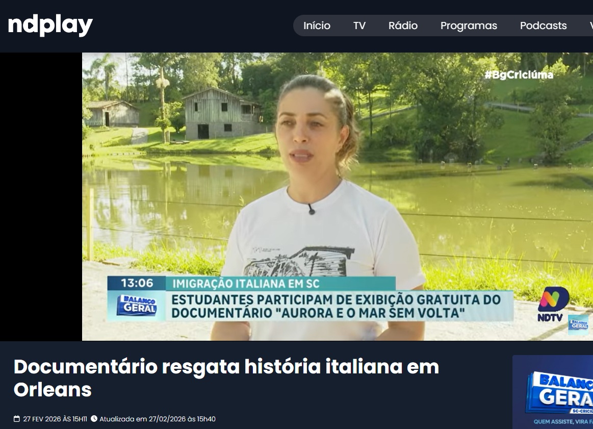 Data de veiculação: 27/02/2026Veículo: ND TV Record - Balanço GeralEditoria: Balanço GeralAssunto: Em Orleans, uma aula de História saiu do formato tradicional e ganhou as telas do cinema. Estudantes participaram de uma exibição especial do documentário Aurora e o Mar Sem Volta, que retrata aspectos marcantes da imigração italiana na região Sul de Santa Catarina. A iniciativa proporcionou uma verdadeira imersão cultural, conectando os alunos às origens de muitas famílias que ajudaram a construir a identidade local. Além de ampliar o conhecimento histórico, a atividade reforça a importância da preservação da memória e das tradições. A reportagem mostra como o cinema pode ser uma ferramenta poderosa de educação e valorização da cultura regional.Link do site: https://ndmais.com.br/video/documentario-resgata-historia-italiana-em-orleans/