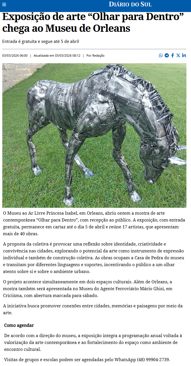 Data de veiculação: 03/03/2026Veículo: Portal Diario do SulEditoria: VariedadesAssunto: O Museu ao Ar Livre Princesa Isabel, em Orleans, abriu ontem a mostra de arte contemporânea “Olhar para Dentro”, com recepção ao público. A exposição, com entrada gratuita, permanece em cartaz até o dia 5 de abril e reúne 17 artistas, que apresentam mais de 40 obras.Link do site: https://diariodosul.com.br/variedades/exposicao-de-arte-olhar-para-dentro-chega-ao-museu-de-orleans-73148