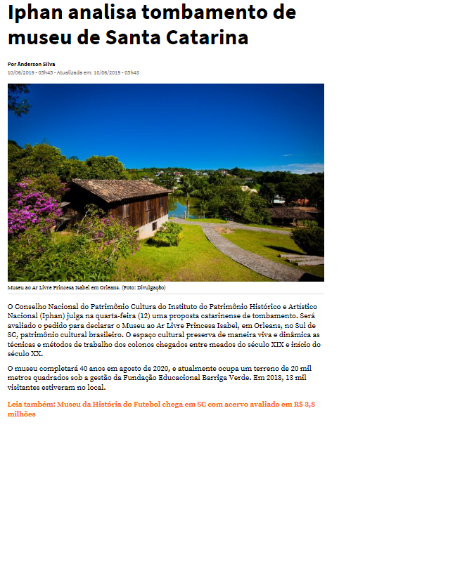 Data de veiculação: 10/06/2019Veículo: NSCTotalEditoria: GeralAssunto: Museu ao ar livre de Orleans, Patrimônio Cultural BrasileiroLink do site: https://www.nsctotal.com.br/colunistas/anderson-silva/iphan-analisa-tombamento-de-museu-de-santa-catarina