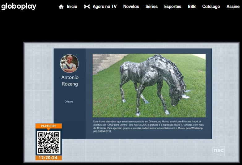 Data de veiculação: 02/03/2026Veículo: NSCTVEditoria: Jornal do Almoço Assunto: O Museu ao Ar Livre Princesa Isabel, em Orleans, recebe, a partir desta segunda-feira, dia 2, a exposição de arte contemporânea “Olhar para Dentro”. A mostra, que tem entrada gratuita, abre às 20h e segue até o dia 5 de abril. Ela reúne 17 artistas, com mais de 40 obras, que propõem ao público uma reflexão sensível sobre o potencial criativo como forma de visibilização do indivíduo e do coletivo na vida urbana.Link do site: https://globoplay.globo.com/v/14393134/