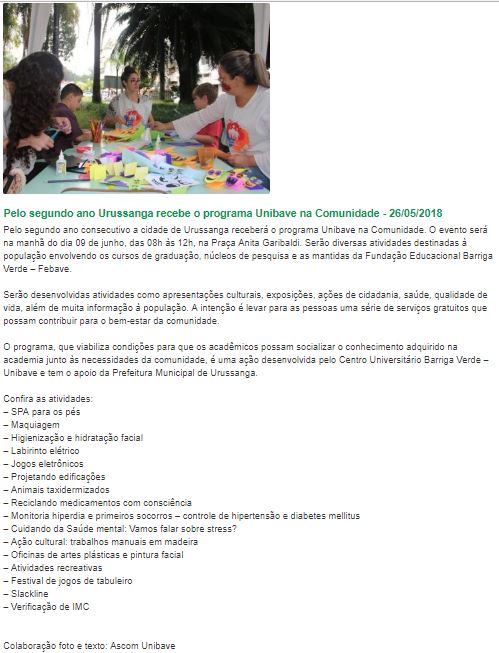 Data de veiculação: 26/05/2018Veículo: Portal CocalEditoria: geralAssunto: Unibave, comunidade, Urussanga, eventoLink do site: http://portalcocal.com.br/noticias_nr.php?id=6001