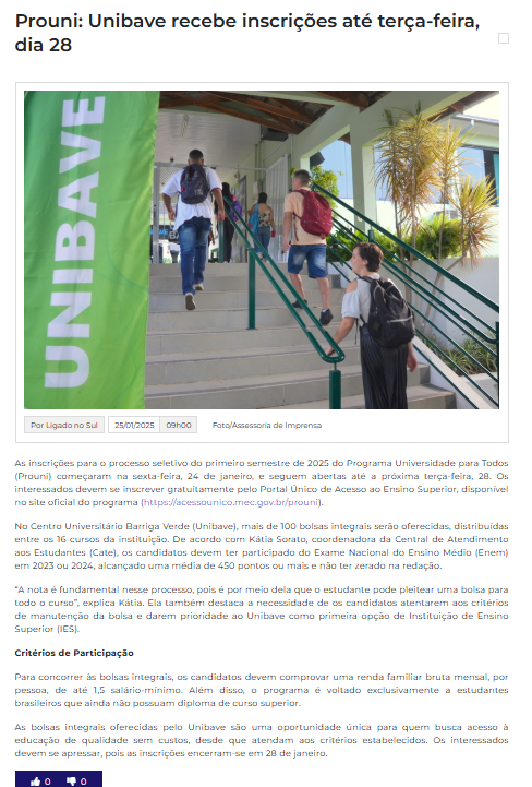 Data de veiculação: 25/01/2025Veículo: Ligado no SulEditoria: GeralAssunto: Unibave, Inscrições, Bolsas de Estudo, ProuniLink do site: https://www.ligadonosul.com.br/educacao/prouni-unibave-recebe-inscricoes-ate-terca-feira-dia-28/