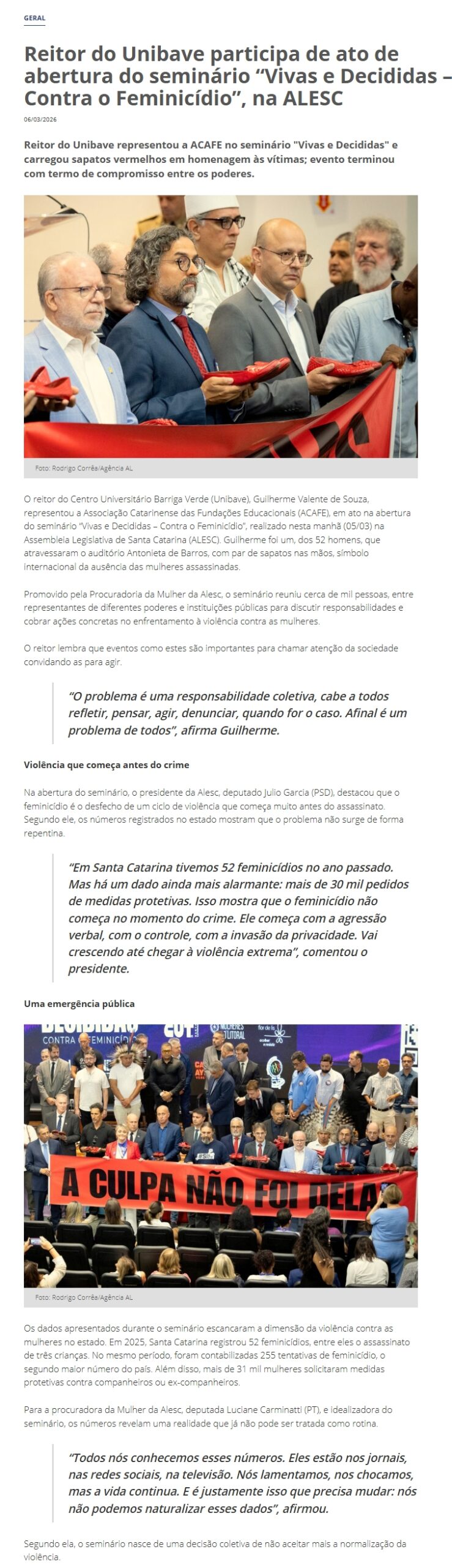 Data de veiculação: 06/03/2026Veículo: SulinfocoEditoria: GeralAssunto: Unibave, Reitor, ALESC, Seminário FeminicídioLink do site: https://www.sulinfoco.com.br/reitor-do-unibave-participa-de-ato-de-abertura-do-seminario-vivas-e-decididas-contra-o-feminicidio-na-alesc/
