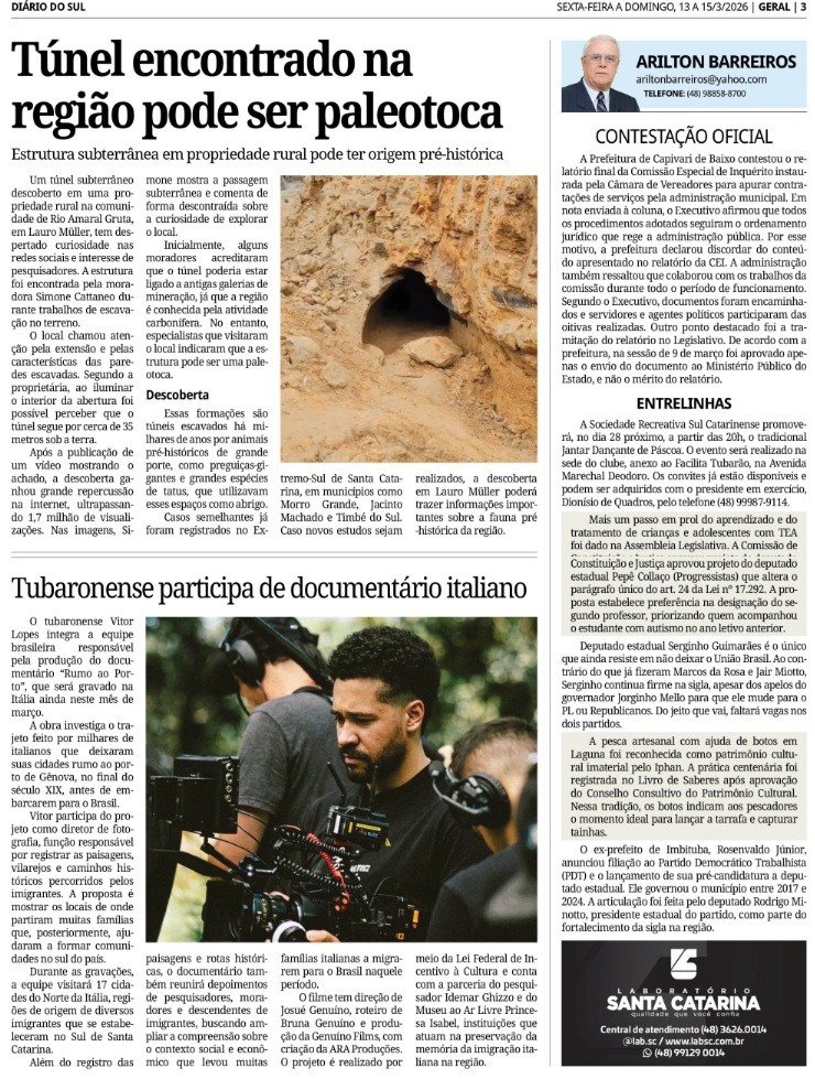 Data de veiculação: 13/03/2026Veículo: Diario do SulEditoria: Pag 03Assunto: O tubaronense Vitor Lopes integra a equipe brasileira responsável pela produção do documentário “Rumo ao Porto”, que será gravado na Itália ainda neste mês de março. O filme tem direção de Josué Genuíno, roteiro de Bruna Genuíno e produção da Genuíno Films, com criação da ARA Produções. O projeto é realizado por meio da Lei Federal de Incentivo à Cultura e conta com a parceria do pesquisador Idemar Ghizzo e do Museu ao Ar Livre Princesa Isabel, instituições que atuam na preservação da memória da imigração italiana na região.Link do site: https://diariodosul.com.br/edicoes/jornais/2983#pag-3