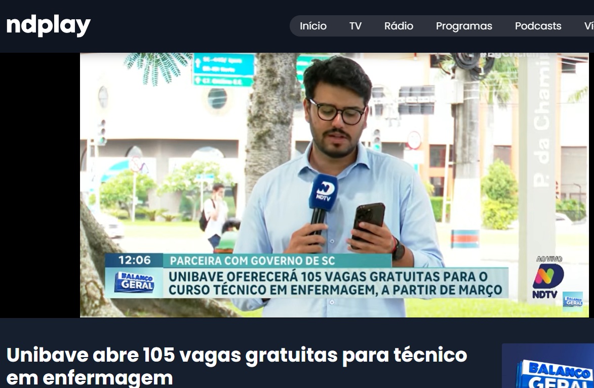 Data de veiculação: 23/02/2026Veículo: Portal Ligado no SulEditoria: Balanço GeralAssunto: A Unibave anunciou a oferta de 105 vagas gratuitas para o curso técnico em enfermagem, ampliando as oportunidades de qualificação profissional em Santa Catarina. A iniciativa busca atender à crescente demanda por profissionais da área da saúde, setor essencial no atendimento à população. FecharLink do site: https://ndmais.com.br/video/unibave-abre-105-vagas-gratuitas-para-tecnico-em-enfermagem/