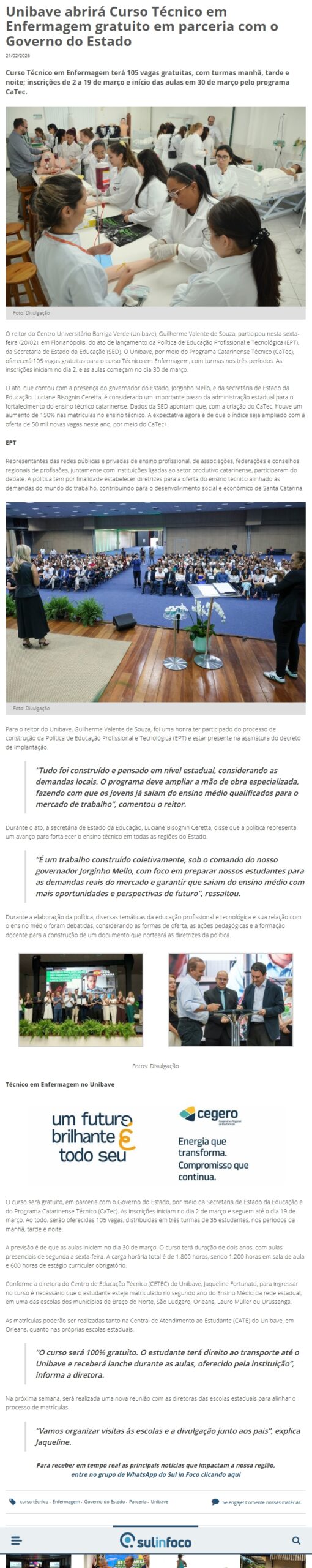 Data de veiculação: 21/02/2026Veículo: SulinfocoEditoria: EducaçãoAssunto: Unibave, Governo do Estado, Curso Técnico em EnfermagemLink do site: https://www.sulinfoco.com.br/unibave-abrira-curso-tecniico-em-enfermagem-gratuiito-em-parceria-com-o-governo-do-estado/