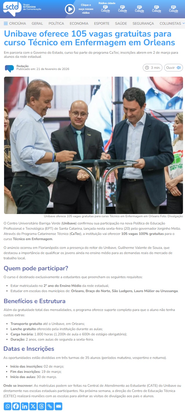 Data de veiculação: 21/02/2026Veículo: SC Todo DiaEditoria: EducaçãoAssunto: O Centro Universitário Barriga Verde (Unibave) confirmou sua participação na nova Política de Educação Profissional e Tecnológica (EPT) de Santa Catarina, lançada nesta sexta-feira (20) pelo governador Jorginho Mello. Através do Programa Catarinense Técnico (CaTec), a instituição vai oferecer 105 vagas 100% gratuitas para o curso Técnico em Enfermagem.Link do site: https://sctd.com.br/educacao/unibave-oferece-105-vagas-gratuitas-para-curso-tecnico-em-enfermagem-em-orleans/