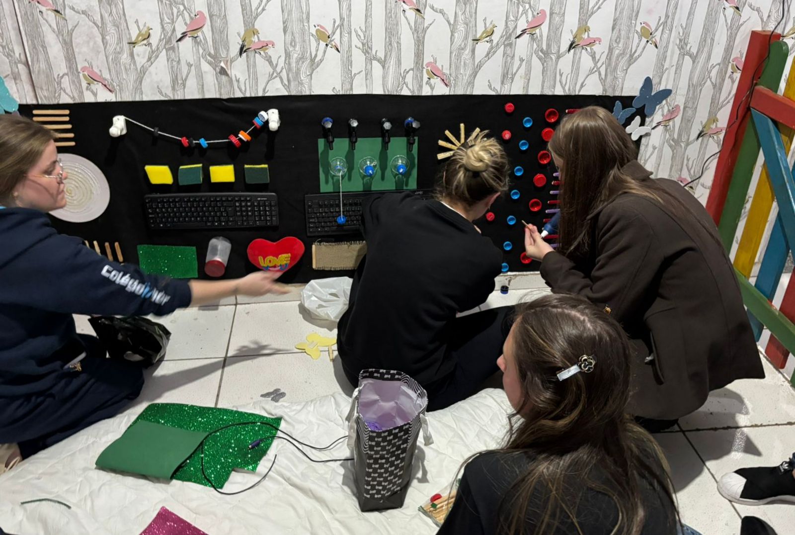 Acadêmicas de Pedagogia do Unibave confeccionam parede sensorial no CIACA, em Braço do Norte