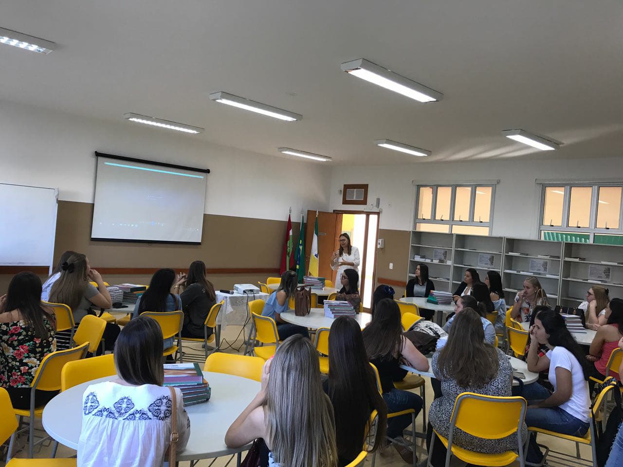 Em seguida, a professora do Pré-escolar apresentou a proposta de trabalho que é desenvolvida na Educação Infantil e posteriormente a professora do 1º ano do Ensino Fundamental fez uma explanação sobre alfabetização e letramento de acordo com as diretrizes curriculares e concepção pedagógica adotadas pela instituição.