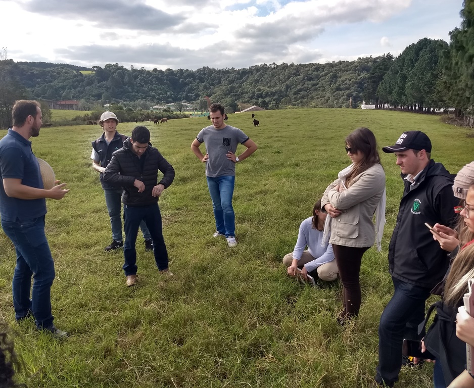 A viagem para Lages foi elaborada com o intuito de levar os acadêmicos à situações práticas comum do dia a dia presente na maioria das propriedades rurais. Durante todo o período matutino, na Universidade do Estado de Santa Catarina – Udesc, os estudantes puderam observar, identificar, vivenciar, perguntar e discutir as principais dúvidas referentes ao manejo experimental de plantas forrageiras de clima tropical, como o capim-quicuio (Pennisetum clandestinum) e o capim Jiggs (Cynodon spp.), e de clima temperado, como o azevém anual (Lolium multiflorum), capim-lanudo (Holcus lanatus), capim dos pomares (Dactylis glomerata), aveia preta (Avena strigosa), trevo branco (Trifolium repens), cornichão (Lotus curniculatus), trevo vermelho (Trifolium pratense) e cevadilha serrana (Bromus catharticus).