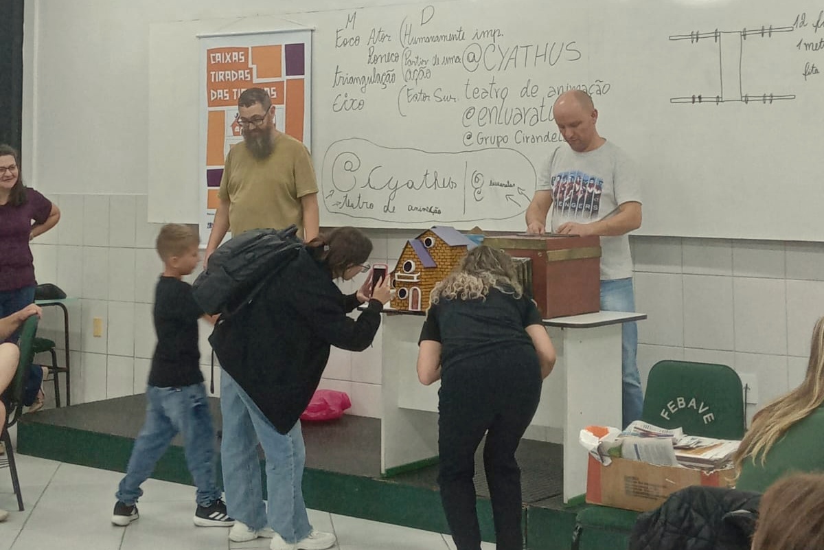 A atividade faz parte da contrapartida do projeto que prevê oficinas e apresentações nos municípios de Forquilhinha, Nova Veneza e Orleans. Os acadêmicos construíram e manipularam um boneco, a partir de folhas de jornal e usando a técnica do Bunrako, além do contato com outras técnicas e com os objetos de pesquisa do projeto, que são as caixas de Lambe-Lambe.
