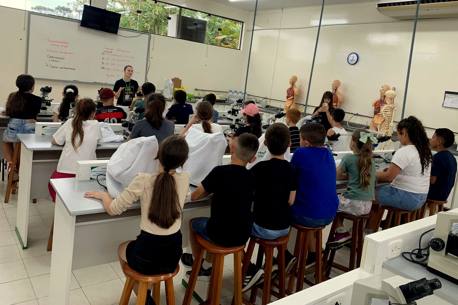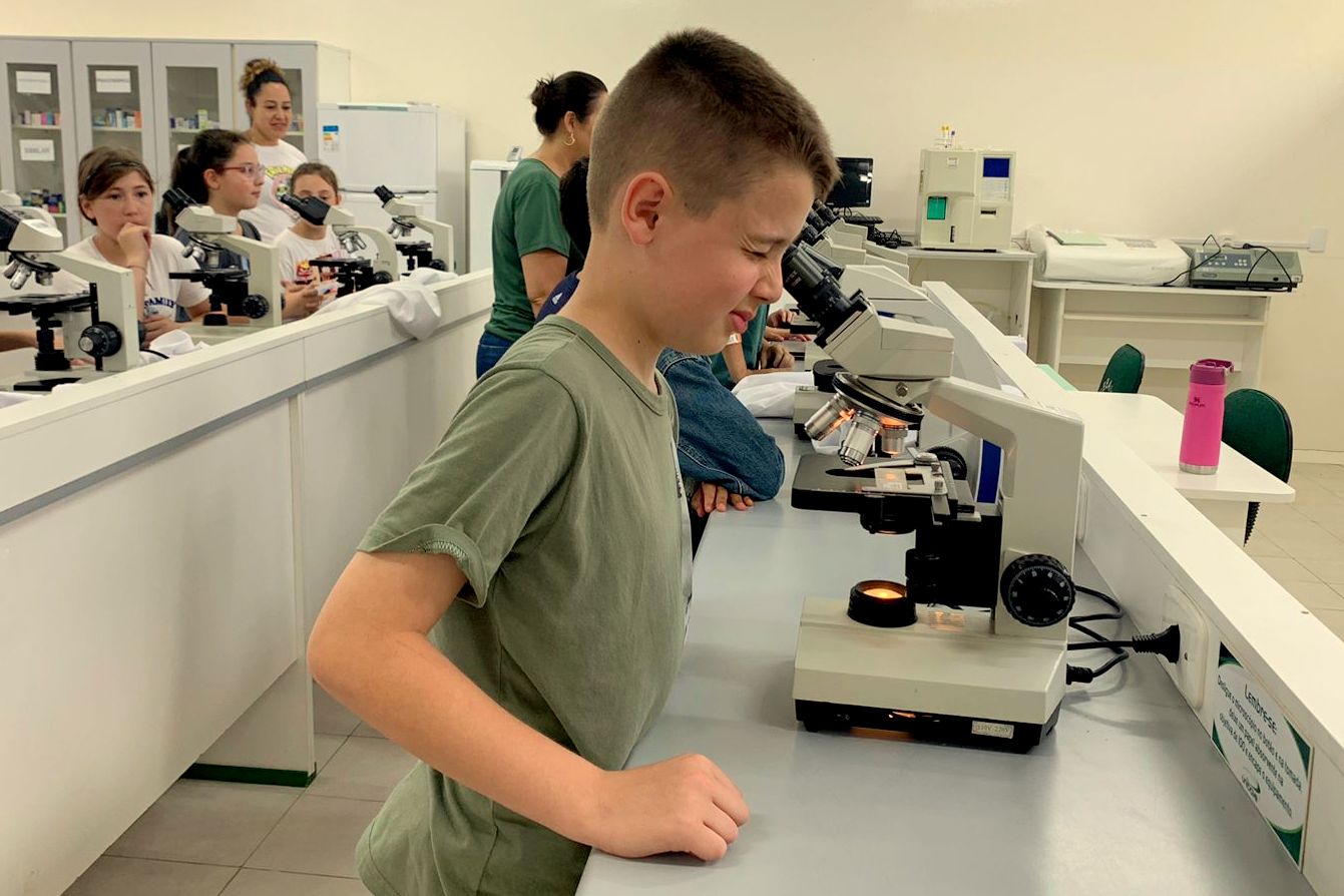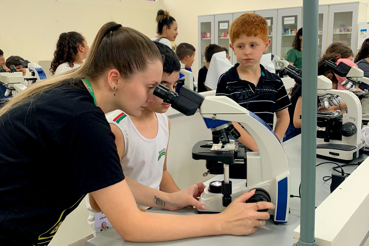Na sequência, a visita prosseguiu nos laboratórios, onde os estudantes realizaram atividades com microscópios, acompanharam experiências e aprenderam mais sobre o corpo humano no laboratório de saúde, em atividades conduzidas pelo professor Marcelo Alano, com o auxílio de Amanda Ugione.