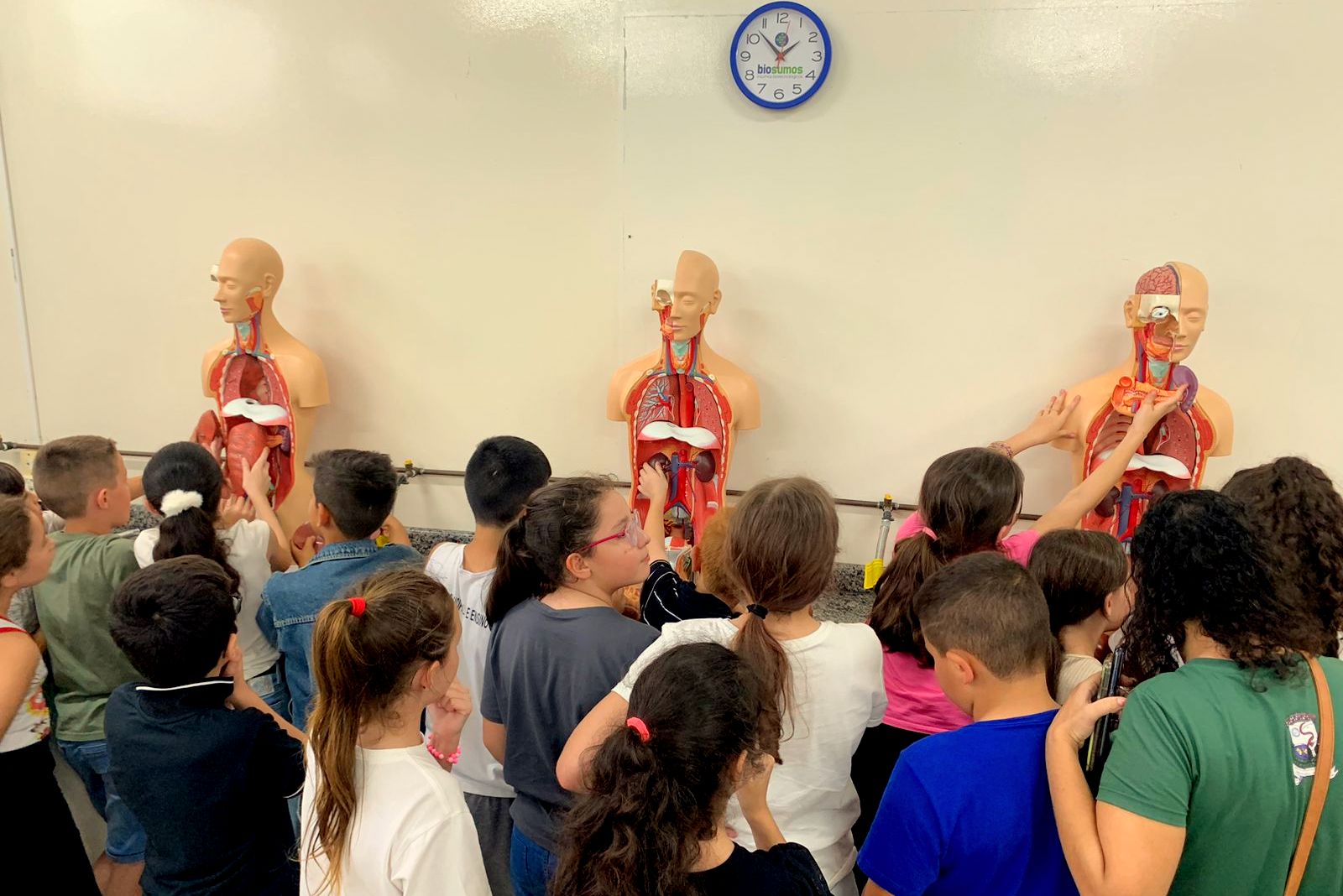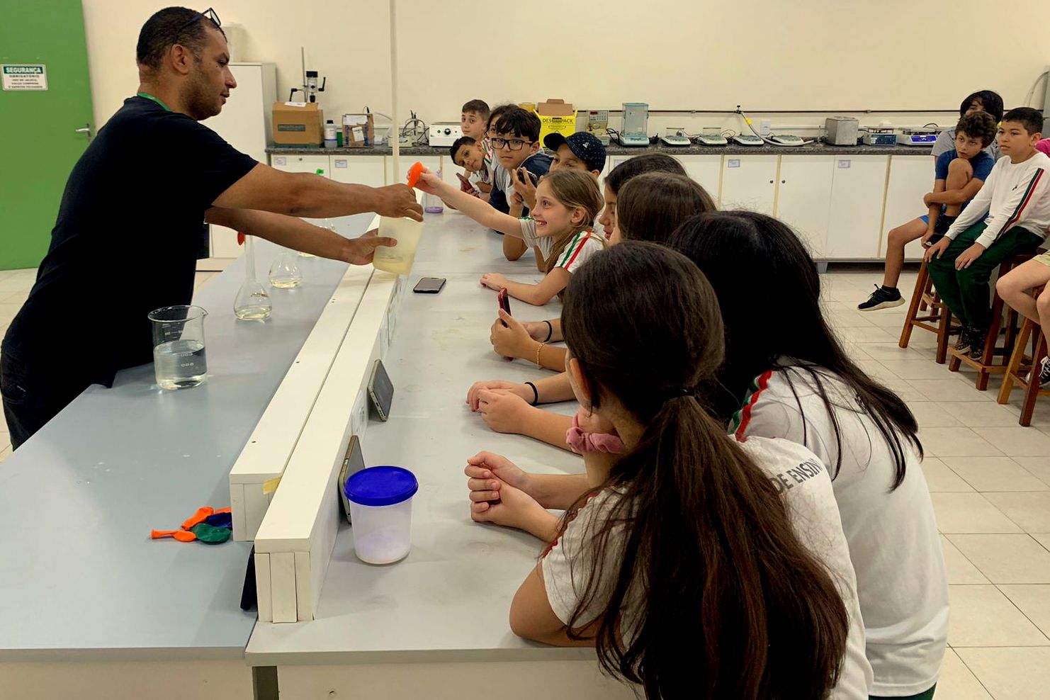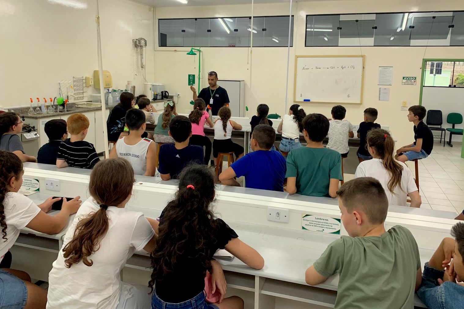 Na sequência, a visita prosseguiu nos laboratórios, onde os estudantes realizaram atividades com microscópios, acompanharam experiências e aprenderam mais sobre o corpo humano no laboratório de saúde, em atividades conduzidas pelo professor Marcelo Alano, com o auxílio de Amanda Ugione.