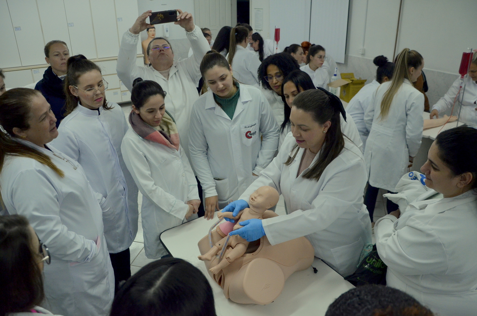 A coordenadora dos laboratórios, Gabriela da Silva Kuelkamp, foi quem acompanhou a visita. No laboratório de Semiologia, os alunos realizaram práticas simuladas sobre coleta sanguínea nos manequins, treinamentos sobre compressão torácica e foram apresentados aos demais equipamentos do laboratório.