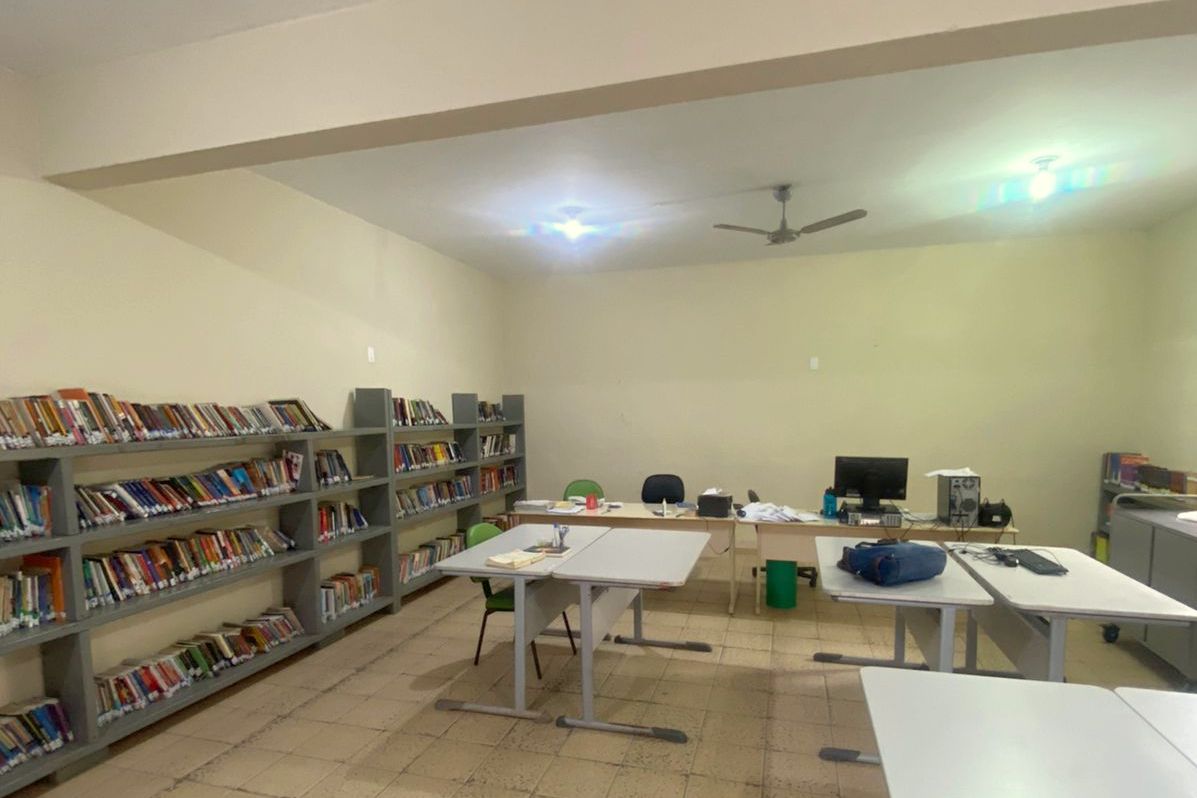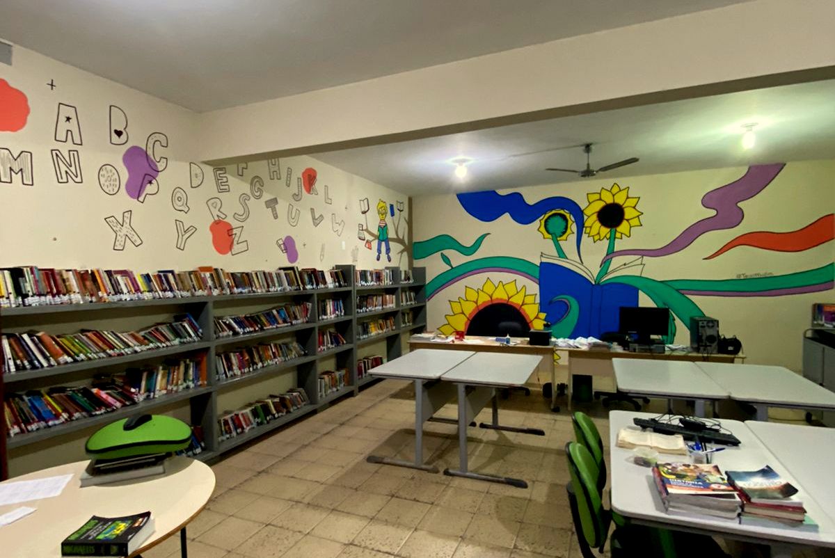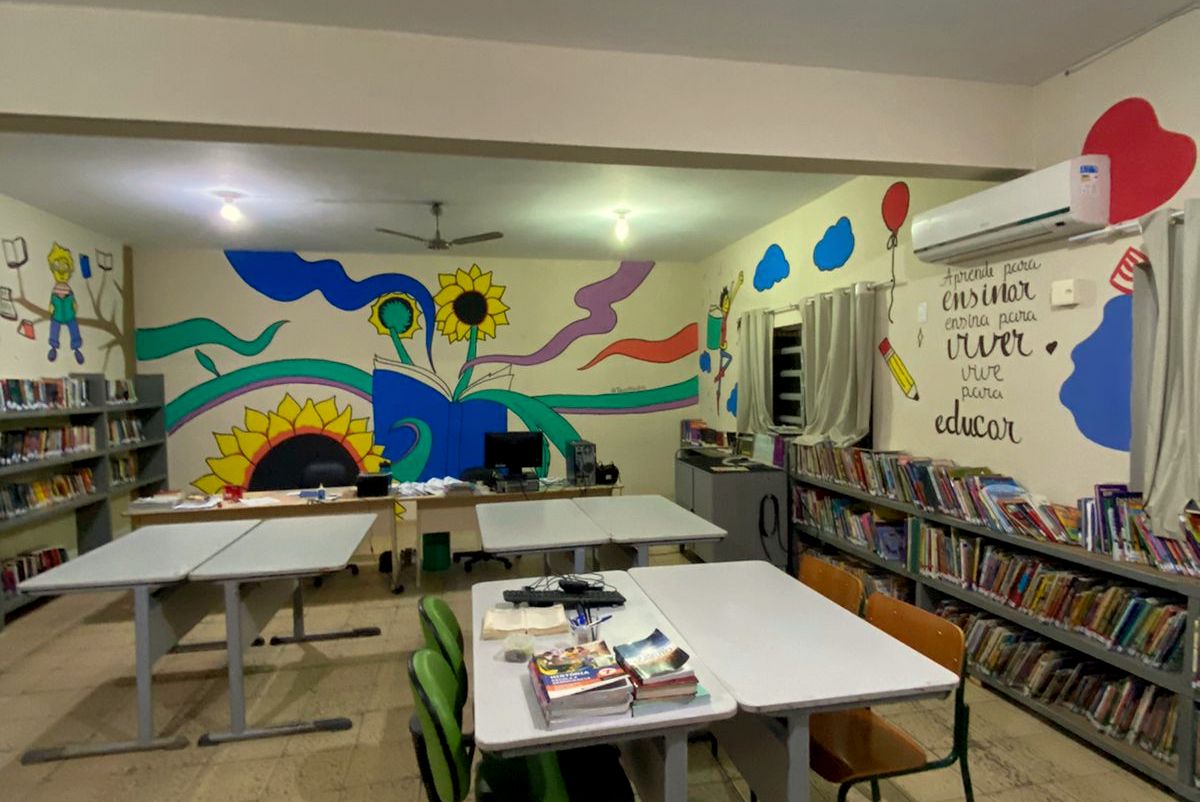 Artista Teo Matos realiza trabalho voluntário na revitalização da biblioteca da Escola Samuel Sandrini, de Orleans
