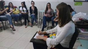 Para esta atividade a professora Rosani convidou a professora Beatriz Buss, egressa do curso de Pedagogia do Unibave, para a socialização de experiências e para apresentação de materiais adaptados. Beatriz, tem experiência como professora II em uma escola municipal da região, o tema abordado na noite foi “Interações pedagógicas entre o segundo professor e o professor titular na perspectiva do ensino colaborativo”.