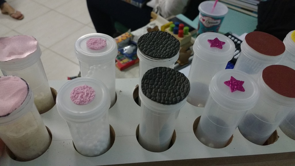A professora Beatriz trouxe experiências de sua prática atual, utilizando jogos, objetos e materiais diversificados que podem ser trabalhados com crianças com vários tipos de deficiências, demonstrando que é possível criar e desenvolver muitas técnicas a partir de materiais simples, que as vezes se tem na própria escola.