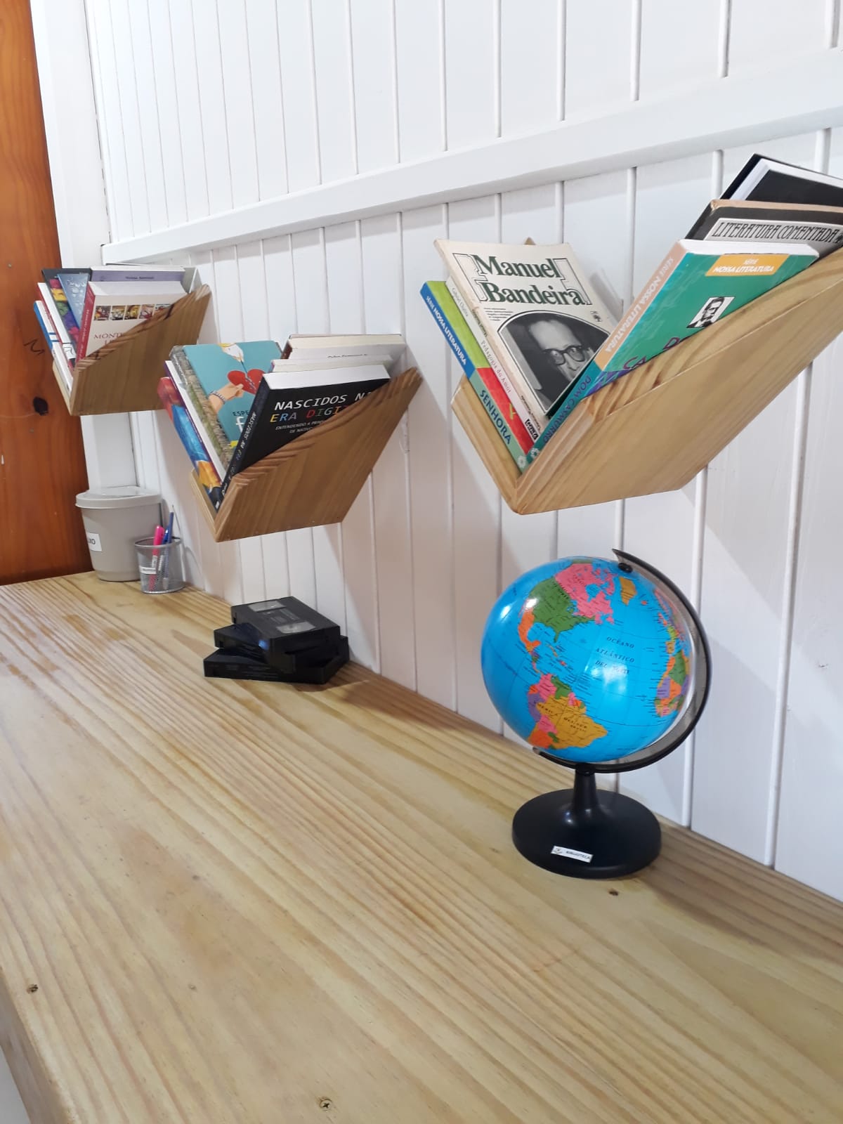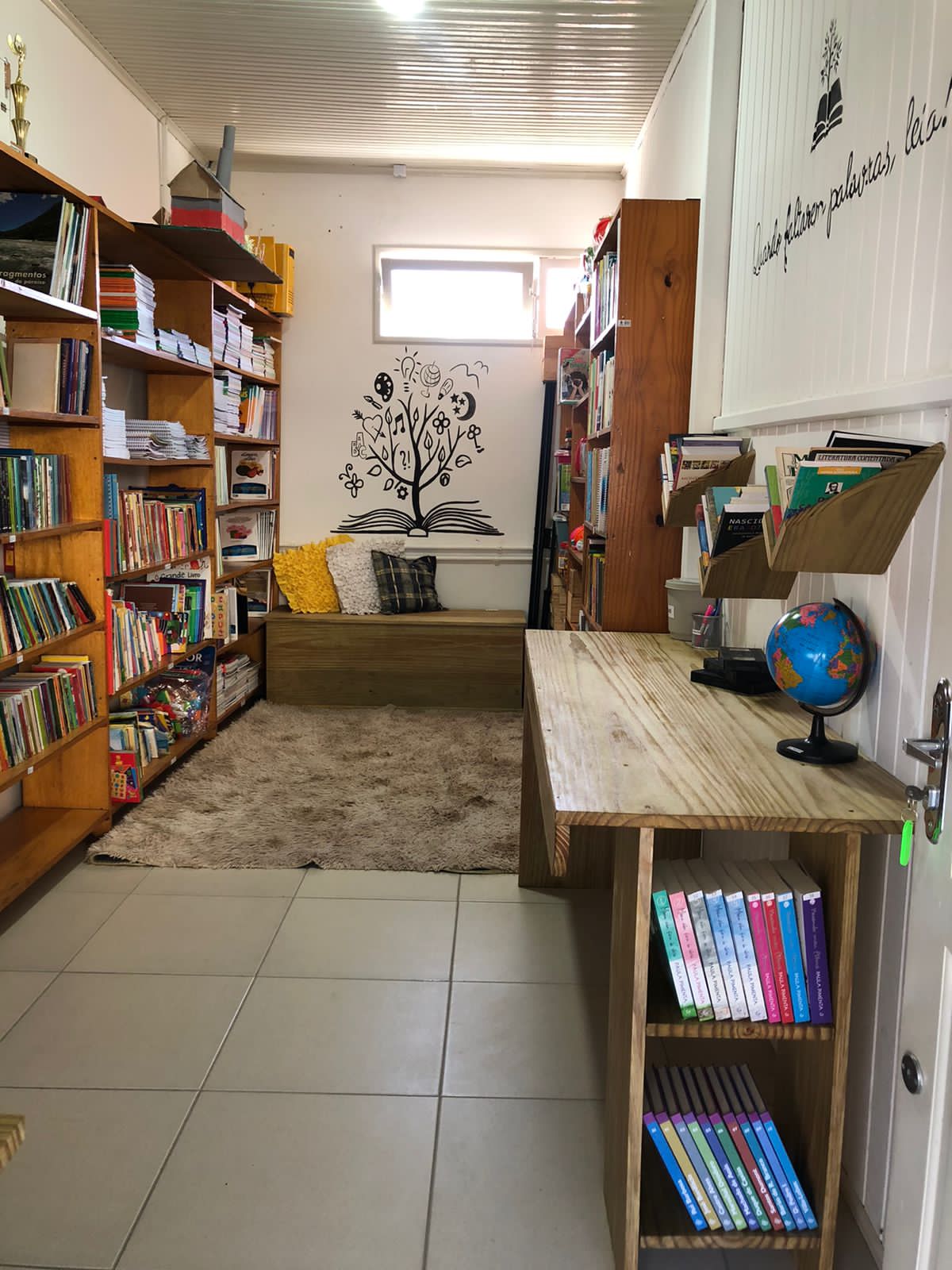 Não foi necessário adquirir mais livros, mas sim uma organização geral no espaço, para permitir o acesso dos alunos. Para a mão de obra, ela contou com voluntários, como os amigos e o pai, seu João Garcia. Os alunos da instituição organizaram e classificaram o acervo de livros. As prateleiras foram numeradas e nomeadas, móveis novos como mesa e até um baú foram confeccionados. ”No baú, foram guardados os mapas corporais, do Brasil e o mapa mundi, que ainda poderá ser usado como banco”, sugere.