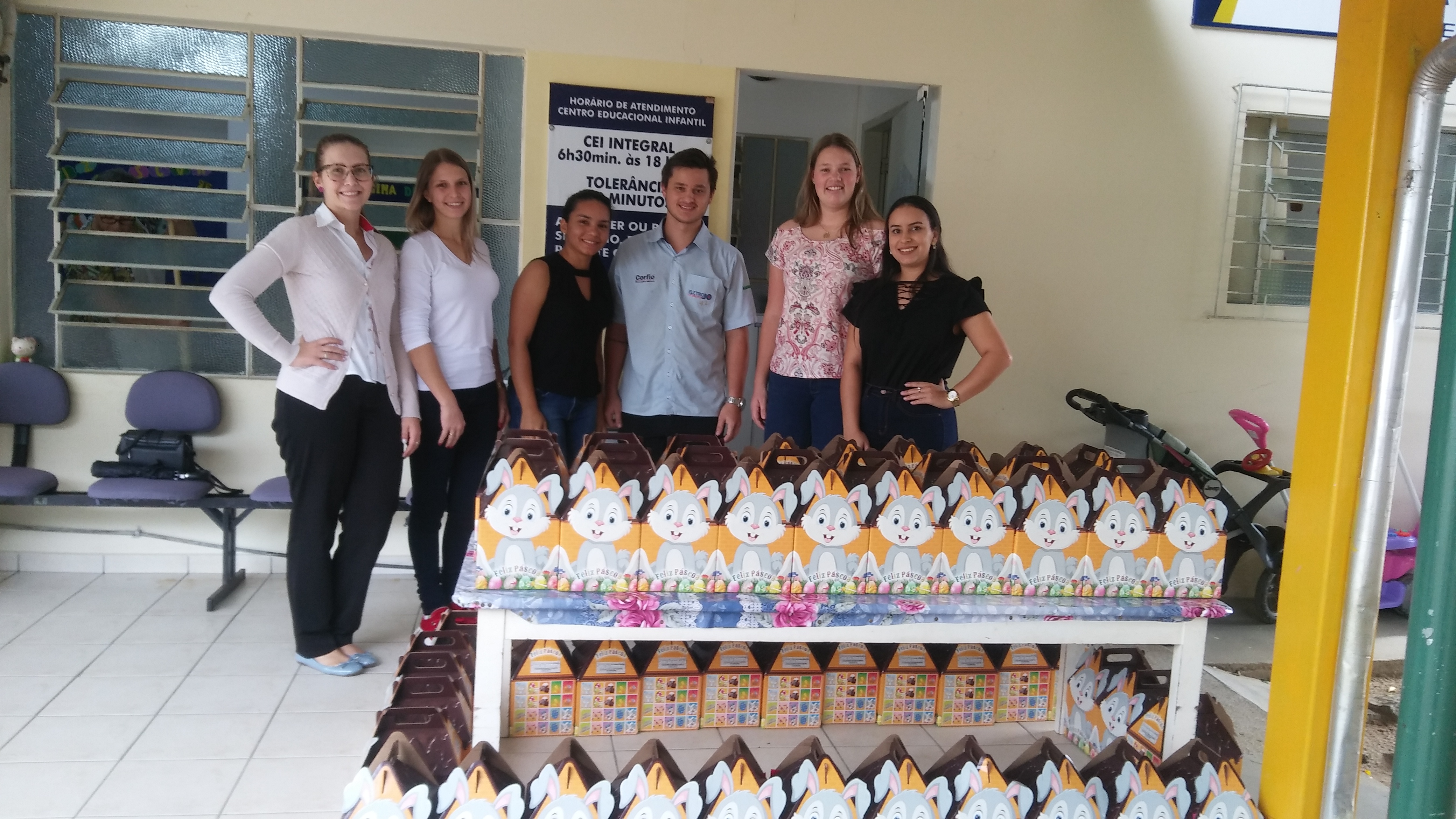 Outro grupo beneficiado pelo Projeto da Páscoa Solidária, foram as crianças do Centro Educacional Adriana Viana Aparecida “Arco-Íris” de Braço do Norte. Segundo a professora Rosinete Santana Silva as crianças ficaram muito felizes com a entrega dos chocolates e com a presença dos acadêmicos do Unibave, “Foi emocionante para todos nós do C.E.I, ser lembrado por pessoas que acreditam no ser. E dessa forma que desejamos a vocês também muita paz, saúde e alegria”. A diretora Maria Eliege, também parabenizou os acadêmicos e a instituição pela ação social, afirmando que “A ação em prol das doações para as crianças do C.E.I foi um momento de grande valia pois ver a felicidade das crianças é algo sem explicação, momento de interação, afeto e acima de tudo demonstração de amor”.