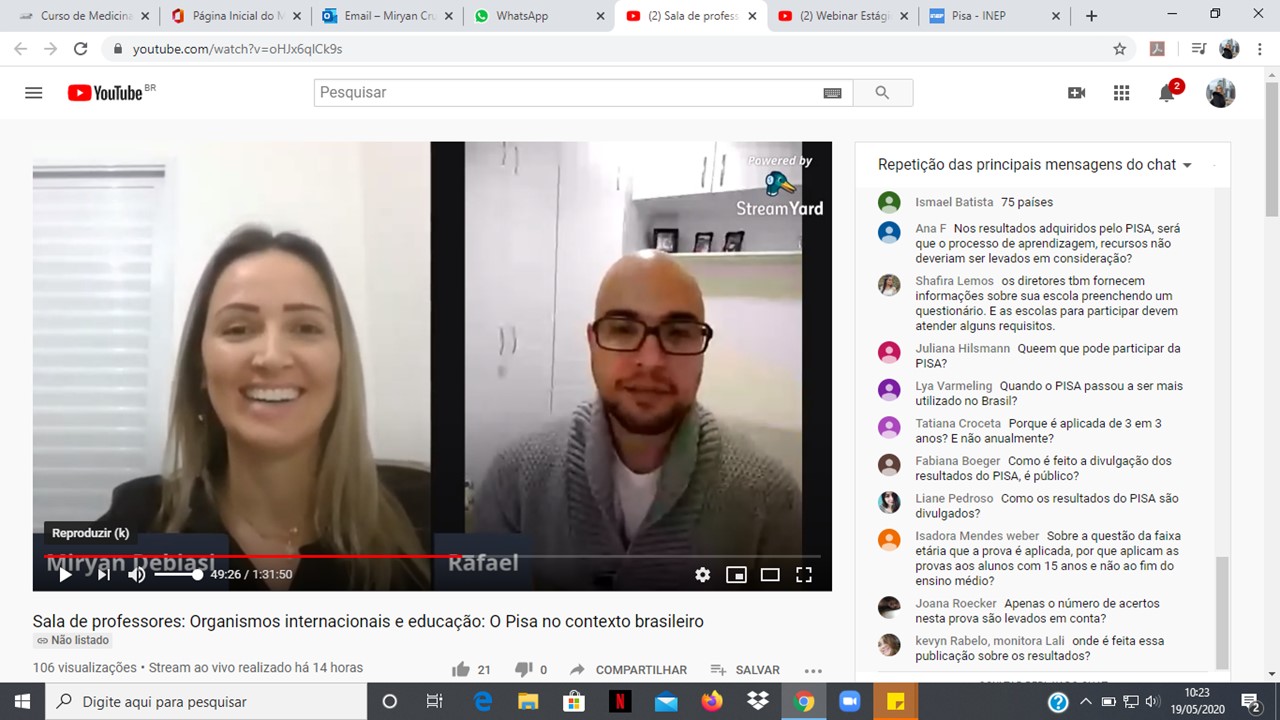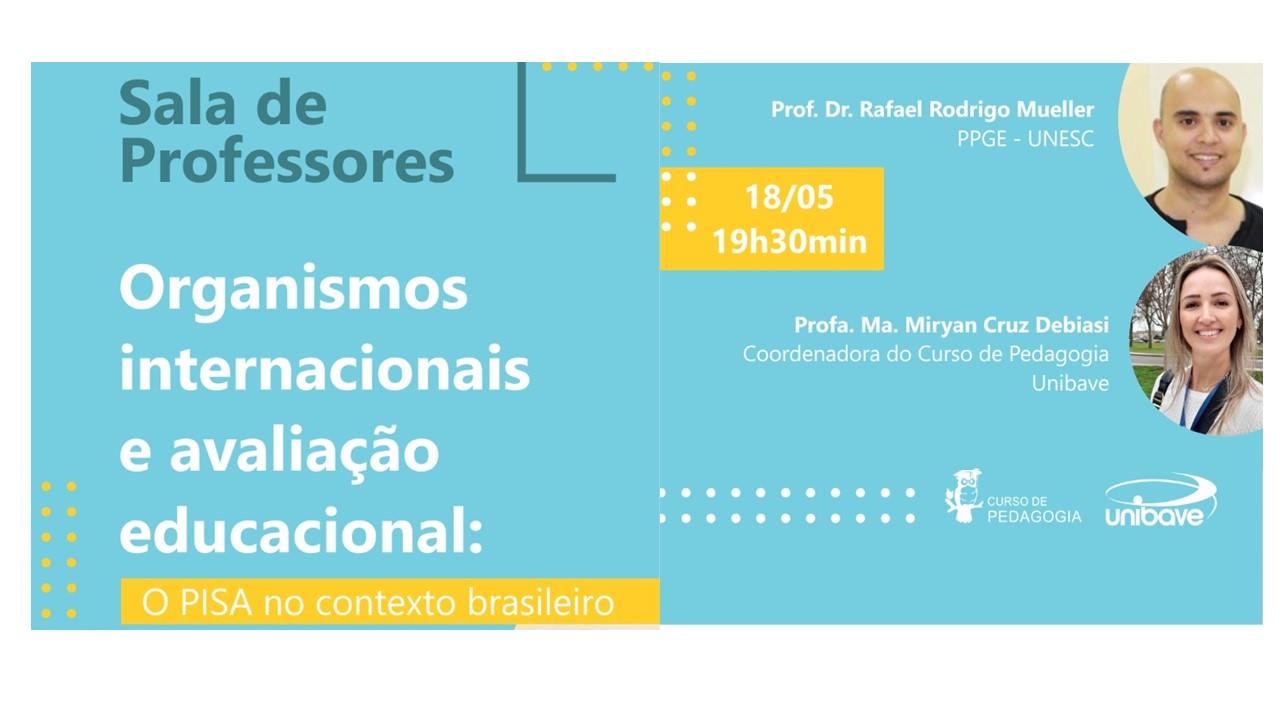 21 de maio de 2020 - CursosNa última segunda-feira, 18, o curso de Pedagogia do Centro Universitário Barriga Verde – Unibave, promoveu o webinar “Organismos internacionais e educação: O Pisa no contexto brasileiro”. A atividade foi promovida pela professora Mestra, Miryan Cruz Debiasi, para a disciplina de Avaliação Educacional, da 7ª fase do curso e contou com a participação do professor, Doutor, Rafael Rodrigo Muller, professor e vice-coordenador do Programa de Pós-Graduação em Educação da Universidade do Extremo Sul Catarinense – Unesc.