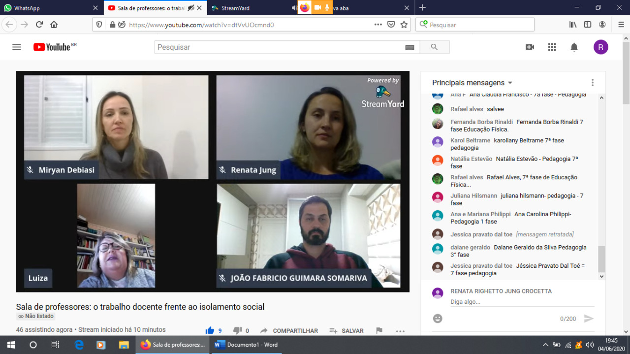 Foram os convidados, a professora, mestra, Luiza Liene Bressan Costa; a professora, Mestra, Miryan Cruz Debiasi, a professora, mestra, Renata Righetto Jung Crocetta e o professor, Mestre, João Fabricio Guimara Somariva, debateram e desenvolveram reflexões sobre o trabalho docente frente ao isolamento social, sobretudo acerca das temáticas de planejamento, currículo e avaliação da Educação Básica.