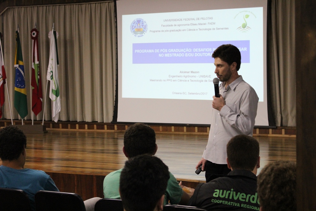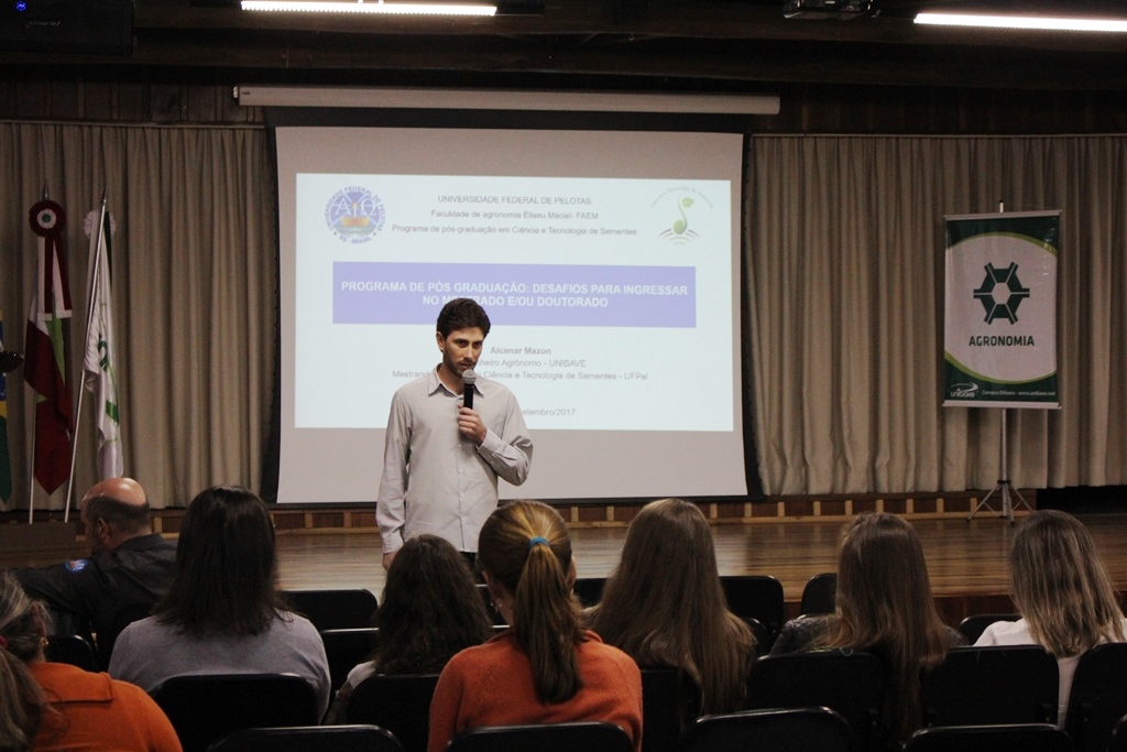 O egresso do curso de Agronomia do Unibave, Alcimar Mazon, ministrou a palestra “Programa de Pós-Graduação: desafios para ingressar no mestrado e/ou doutorado”, nesta última sexta-feira, 15, na sétima edição da Saagro – Semana Acadêmica de Agronomia do Unibave.