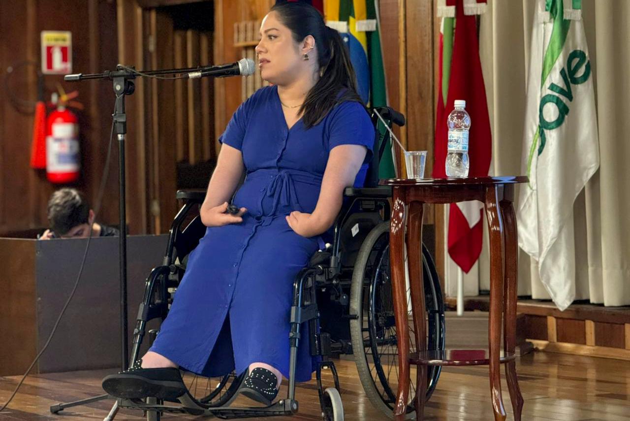 Mulher e mãe com deficiência, Karla compartilhou sua trajetória acadêmica e profissional, aliando vivências pessoais a fundamentos teóricos. Durante a palestra, abordou práticas de educação inclusiva e a importância do enfrentamento ao capacitismo no contexto universitário.