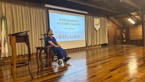 Mulher e mãe com deficiência, Karla compartilhou sua trajetória acadêmica e profissional, aliando vivências pessoais a fundamentos teóricos. Durante a palestra, abordou práticas de educação inclusiva e a importância do enfrentamento ao capacitismo no contexto universitário.
