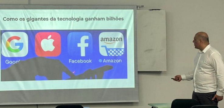 O professor abordou temas como inteligência artificial, automação de processos, experiência do usuário e inovação aberta nas organizações. “Ele usou uma abordagem dinâmica e interativa, apresentando movimentos globais em inovação digital, transformação organizacional e tendências emergentes na área da tecnologia”, descreveu o professor Alessandro.