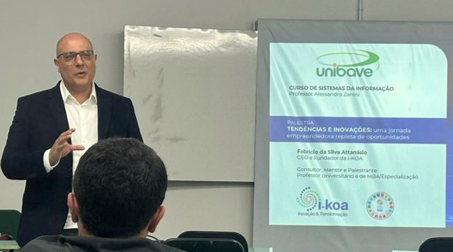 Acadêmicos da 4ª fase do curso de Sistemas de Informação do Centro Universitário Barriga Verde (Unibave) participaram, na quinta-feira (02/10), de uma palestra com o tema “Tendências e Inovação”, conduzida pelo CEO da i-Koa – Inovação & Transformação, professor Fabrício Attanásio. A atividade foi realizada dentro da disciplina Engenharia de Software, ministrada pelo professor Alessandro Zanini, com o objetivo de proporcionar um momento de reflexão estratégica sobre os desafios e oportunidades do cenário tecnológico atual.