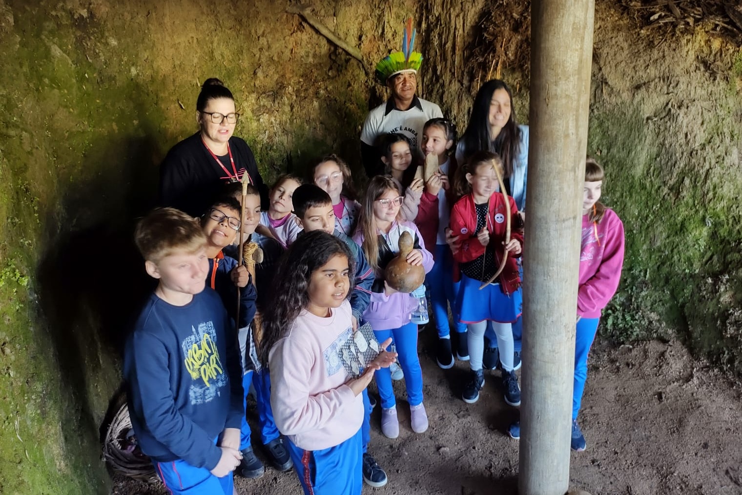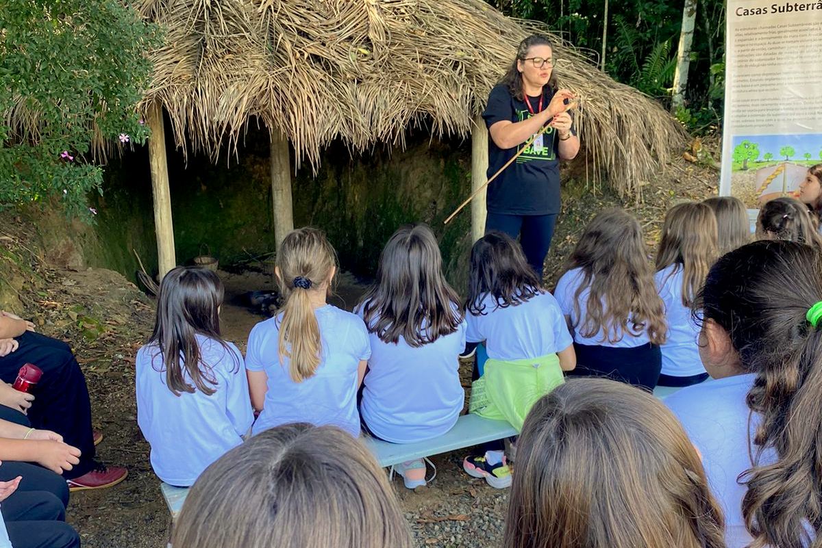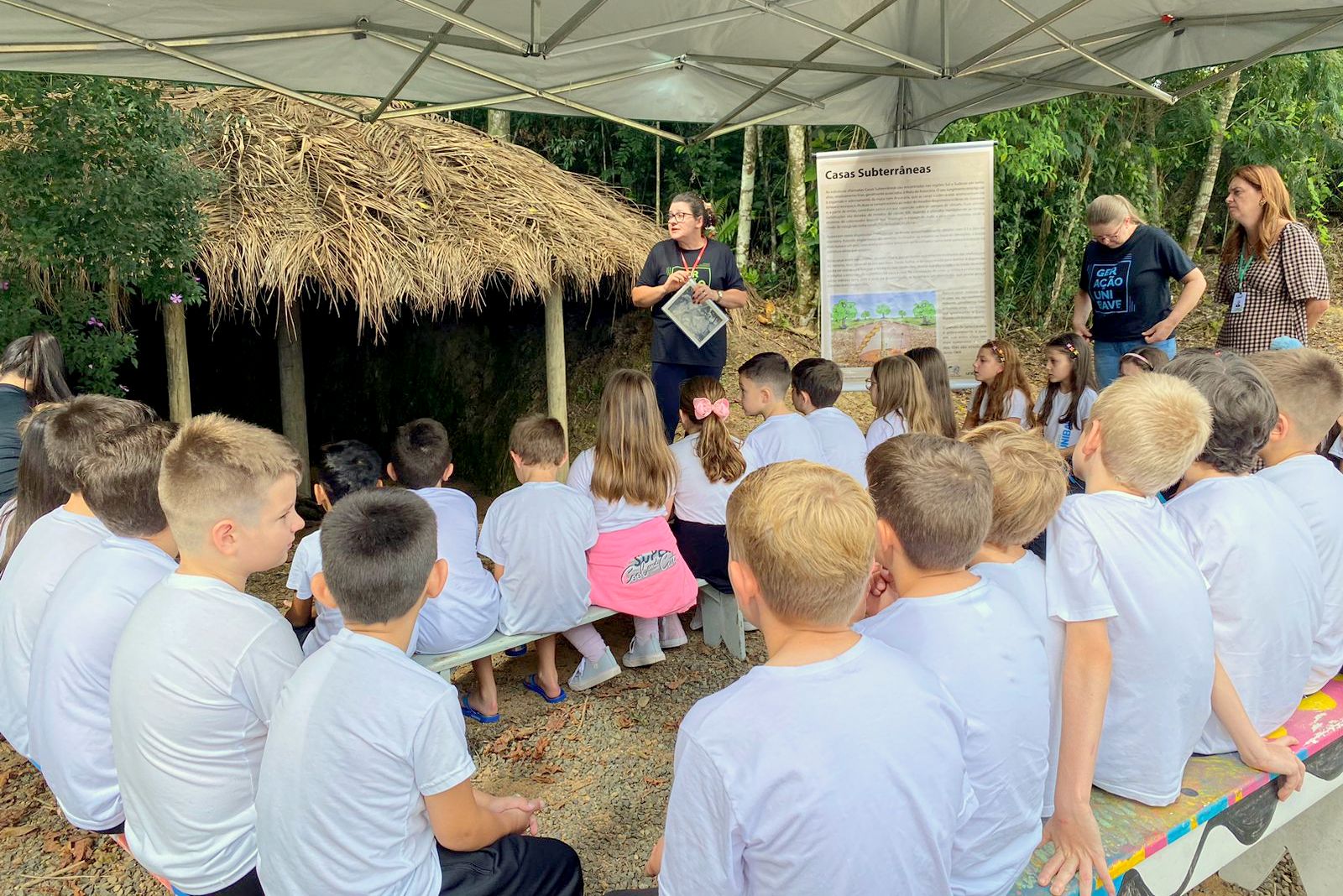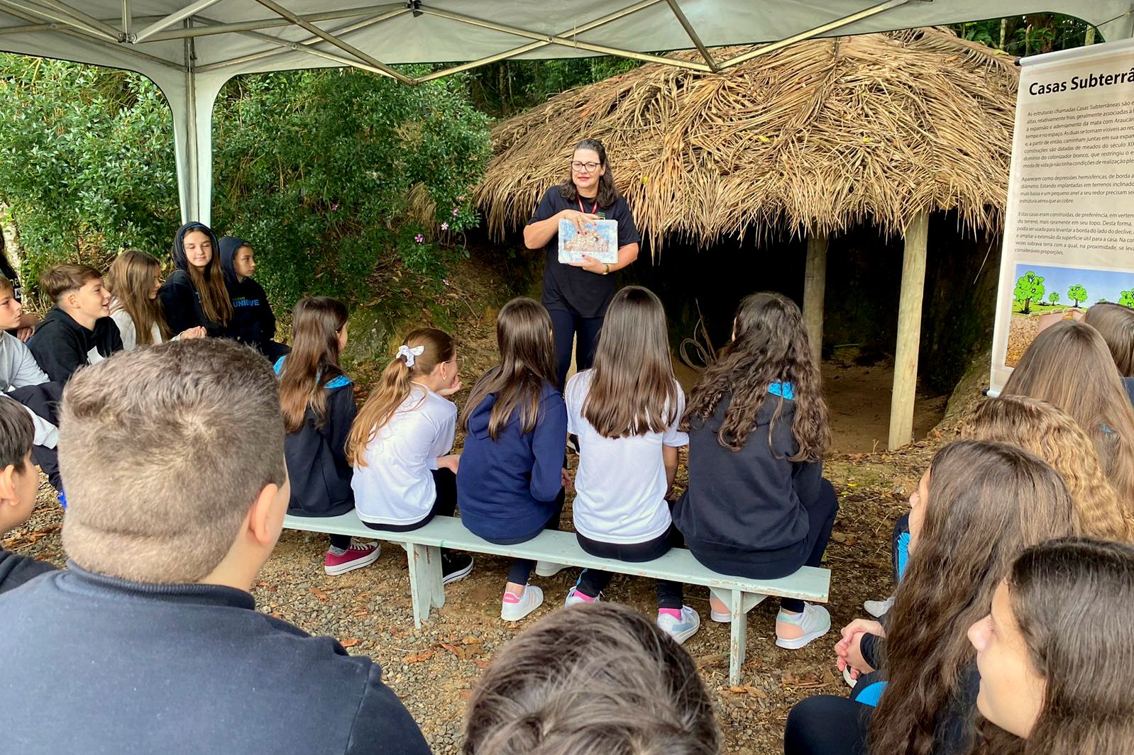 Os visitantes, acompanhados dos professores, participaram de uma conversa sobre as habitações indígenas, abordando os vários tipos de construções. “Construímos no espaço do Museu uma réplica de uma casa subterrânea e de um acampamento Xokleng. Organizamos o ambiente com acervo indígena e com alguns tipos de alimentos que eram coletados por eles”, descreve a colabora do Museu, Rosani Hobold Duarte.