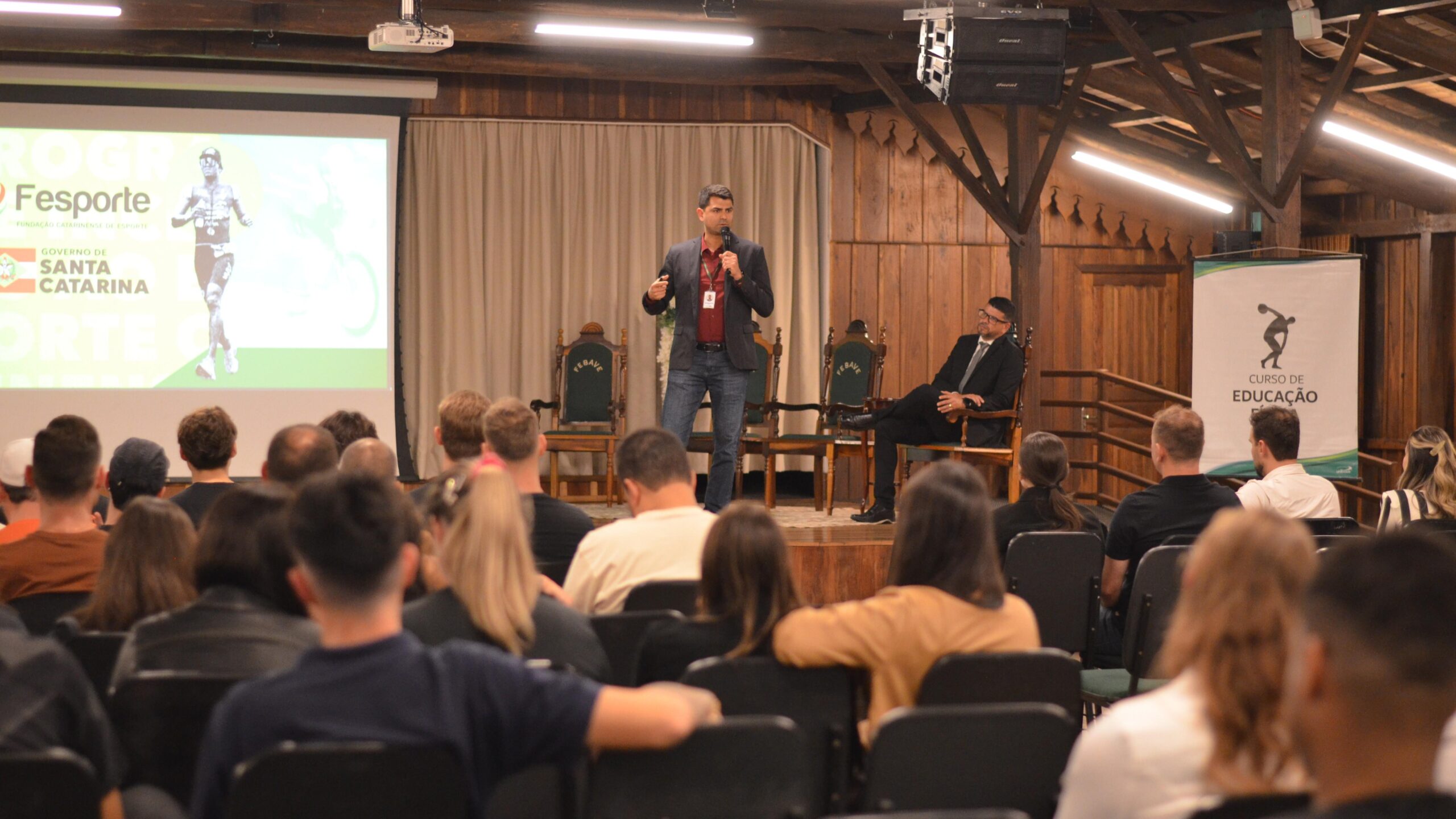 A programação contou com três palestras que trouxeram diferentes perspectivas sobre o funcionamento do sistema esportivo em Santa Catarina. Os primeiros a se apresentarem foram o diretor de Políticas e Projetos Esportivos da Fundação Catarinense de Esporte (FESPORTE), Jorge Davi Agostinho da Silva e o analista de Esporte na FESPORTE, Leonardo De Lucca, que falaram a respeito do papel da Fundação na promoção e organização do esporte no estado e do Programa de Incentivo ao Esporte (PIE).