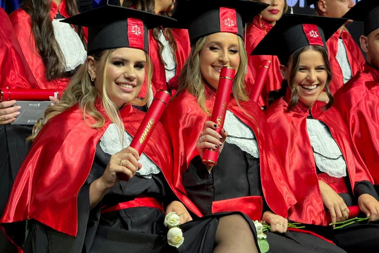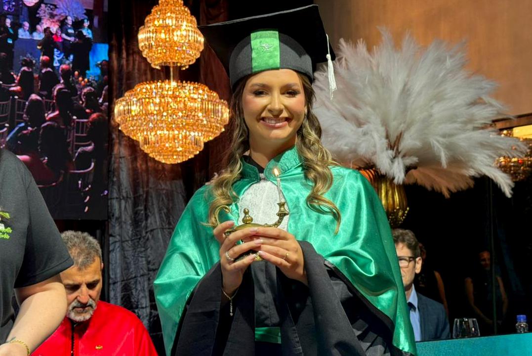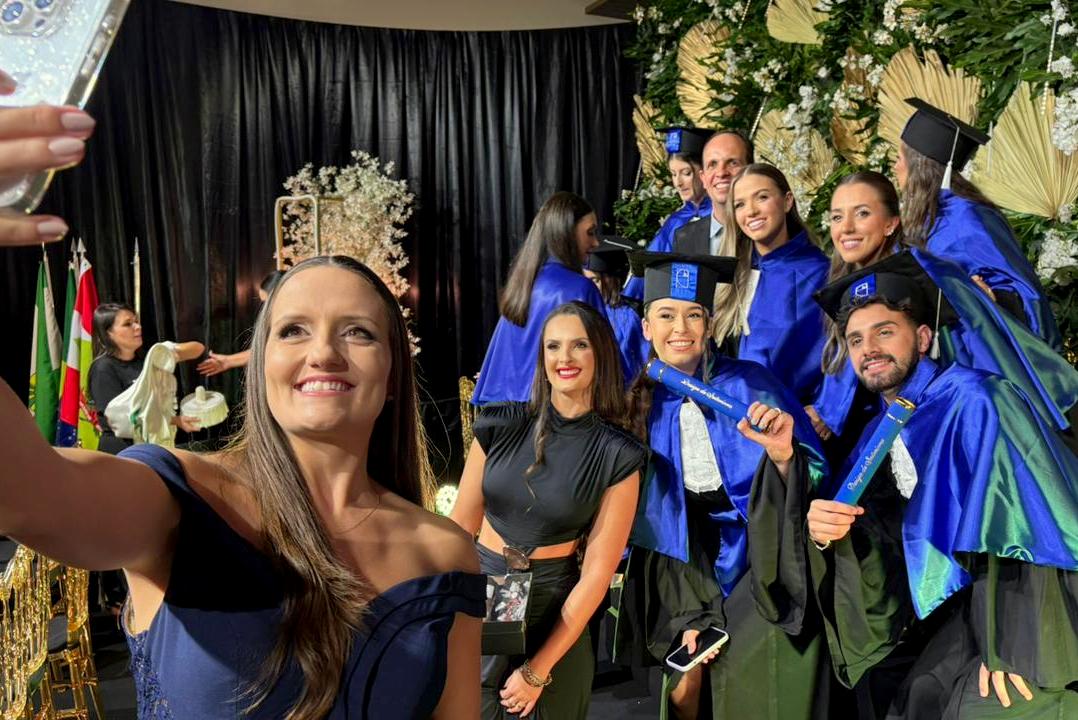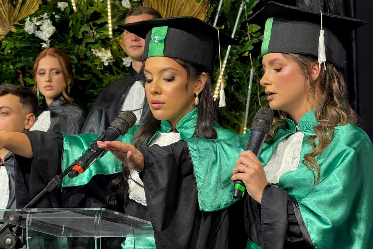 Também participaram da solenidade duas profissionais do curso de Enfermagem, Thaís Prandi e Tuani Mazon Vieira, que já haviam realizado a colação de grau em gabinete e estiveram presentes para os cumprimentos oficiais.