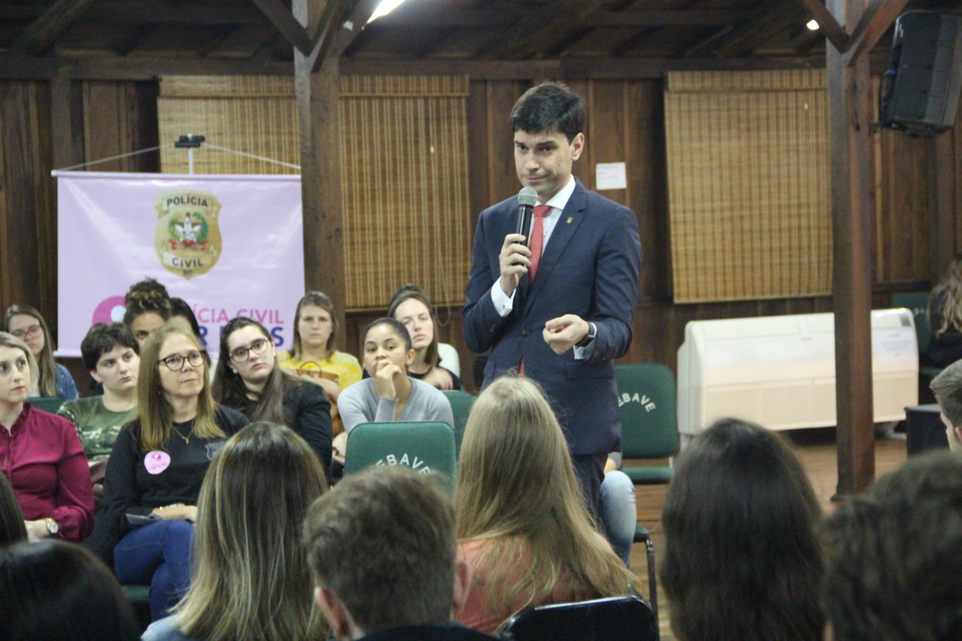 O bate-papo contou com três debatedores, a professora Lilian Motta Gomes, que trabalha na Secretaria de Segurança Pública de Santa Catarina – SSP/SC exercendo a função de psicóloga da Polícia Civil de Criciúma, a psicóloga e advogada Daniela Tezza Canever, e o delegado de Orleans, Ulisses Gabriel.